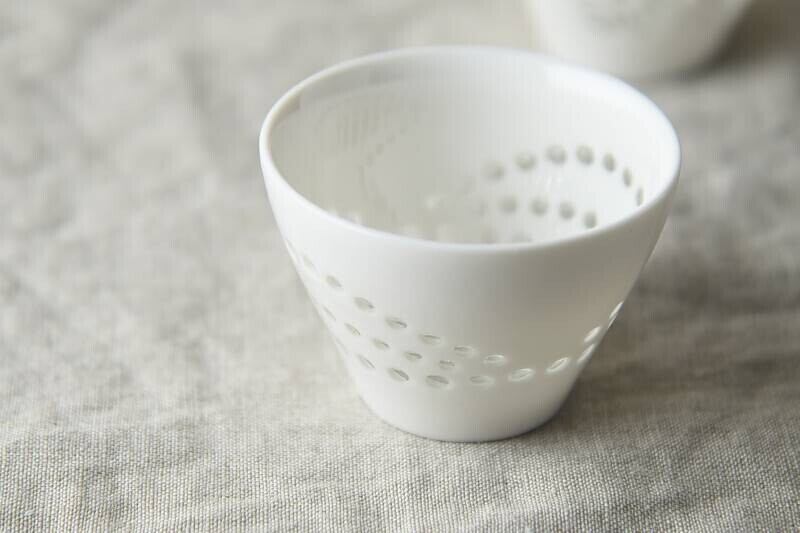 蛍手は透彫(すかしぼり)にした後、透明釉をその小穴に充填して焼成する技法です。