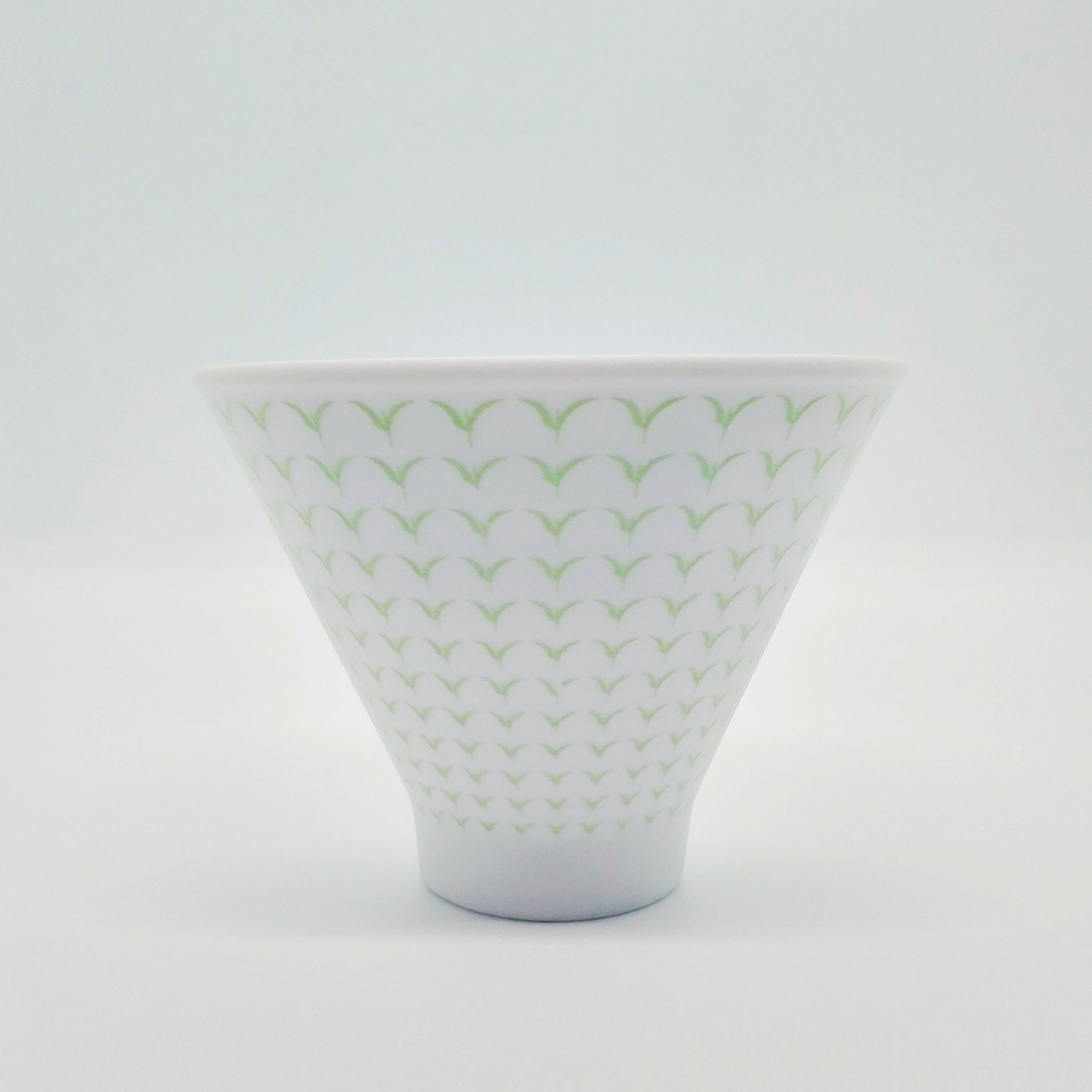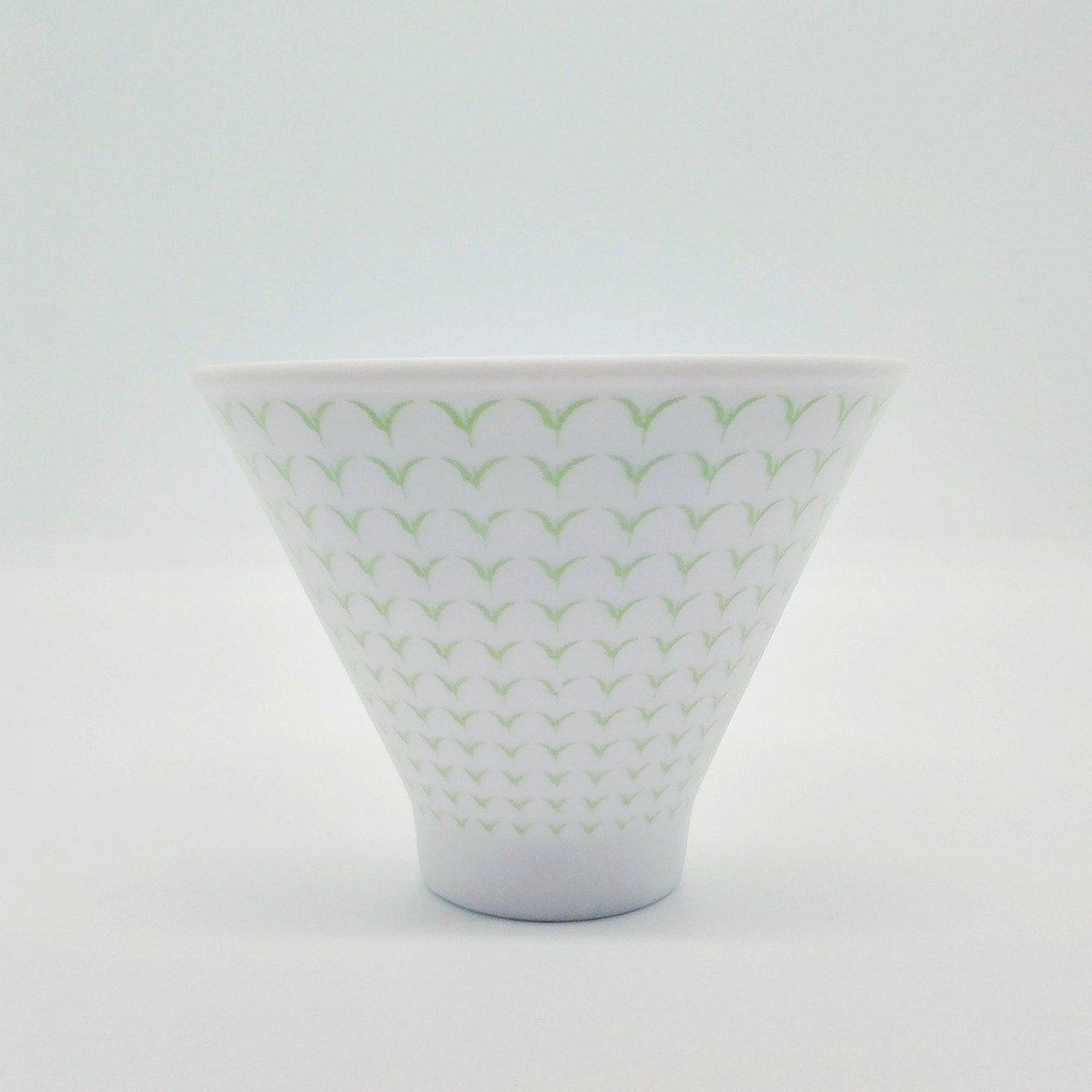 お茶の新芽の葉をモチーフにした絵柄は、独自の技法(釉薬銅版絵付)を用いて、縞模様に仕上げた軽やかな絵柄。