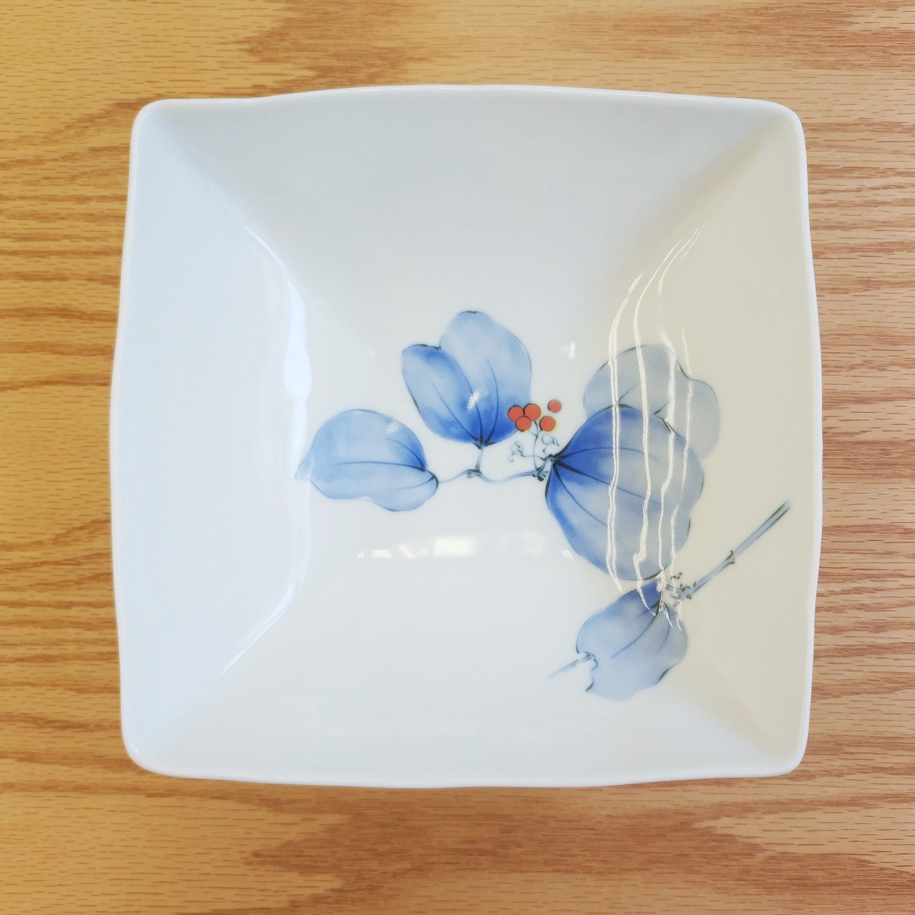 その山帰来を控えめな優しい色合いの染付で描がいた角大鉢です。