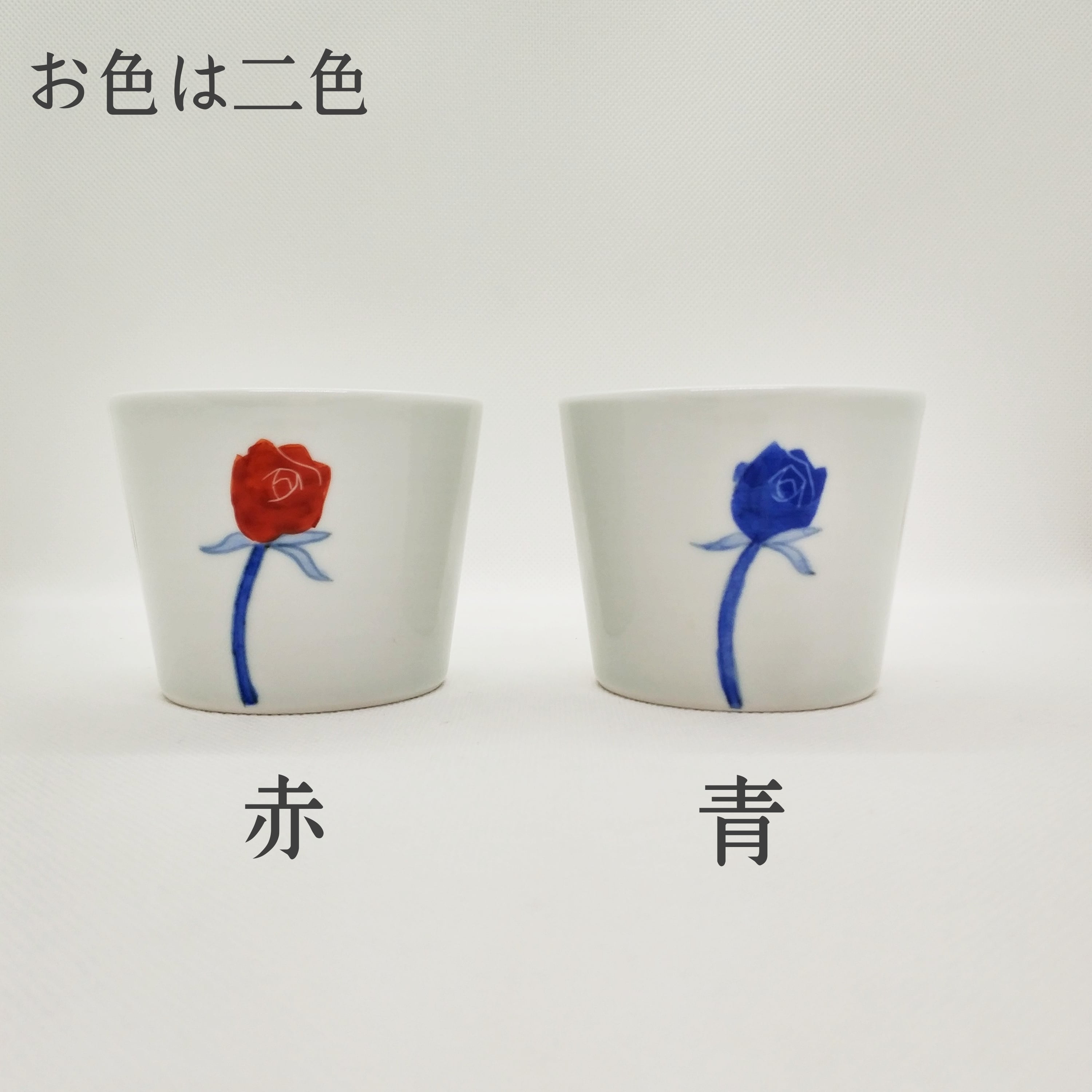 スッキリとしたフォルムに呉須で描かれた青バラ一輪の気品あるカップです。