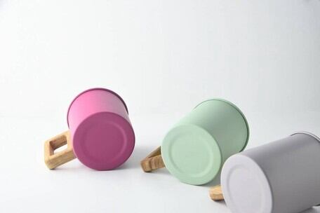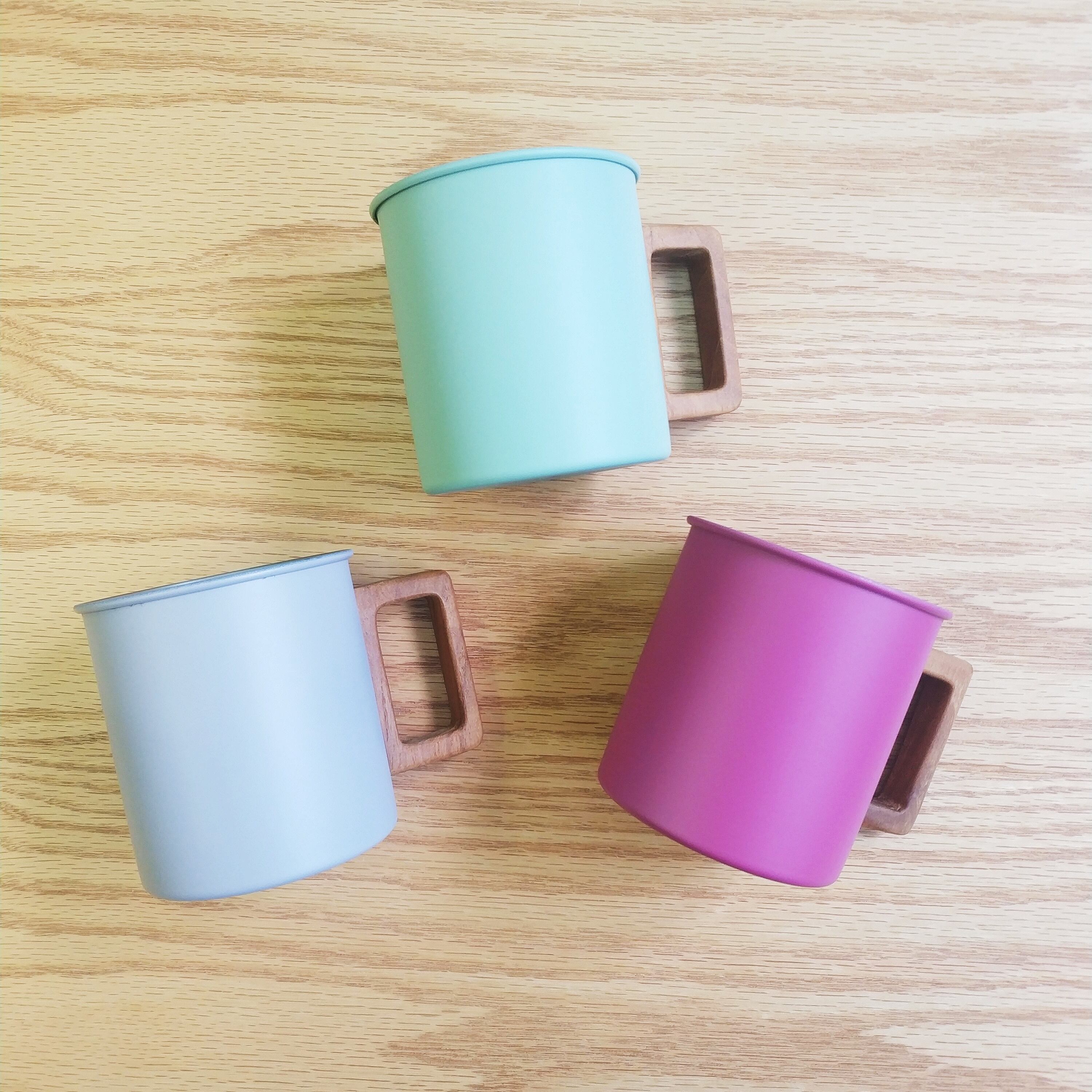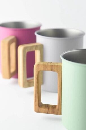 木製の柄と落ち着いたカラーリングがモダンなマグカップ。
