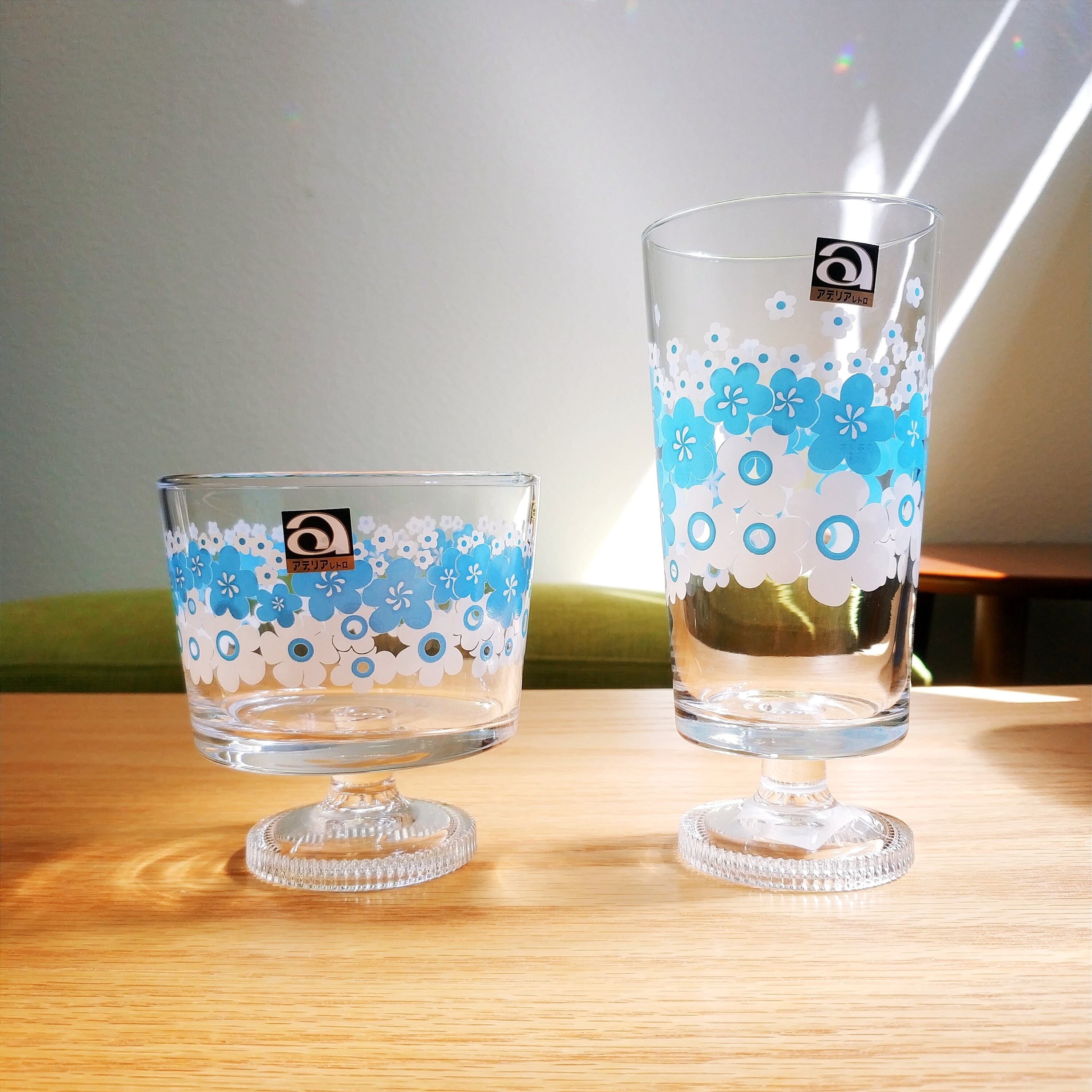 白と水色の組合せが爽やかな「花の輪」は、昭和51年(1976年)に発売された柄です。昭和当時はクリアブルーのグラスにプリントされていました。大小のポップなお花が咲きこぼれた、動きのあるデザインが印象的です。涼やかな色合いのお花が何輪も重なり合うように描かれ、可憐で優しい雰囲気が漂っています。